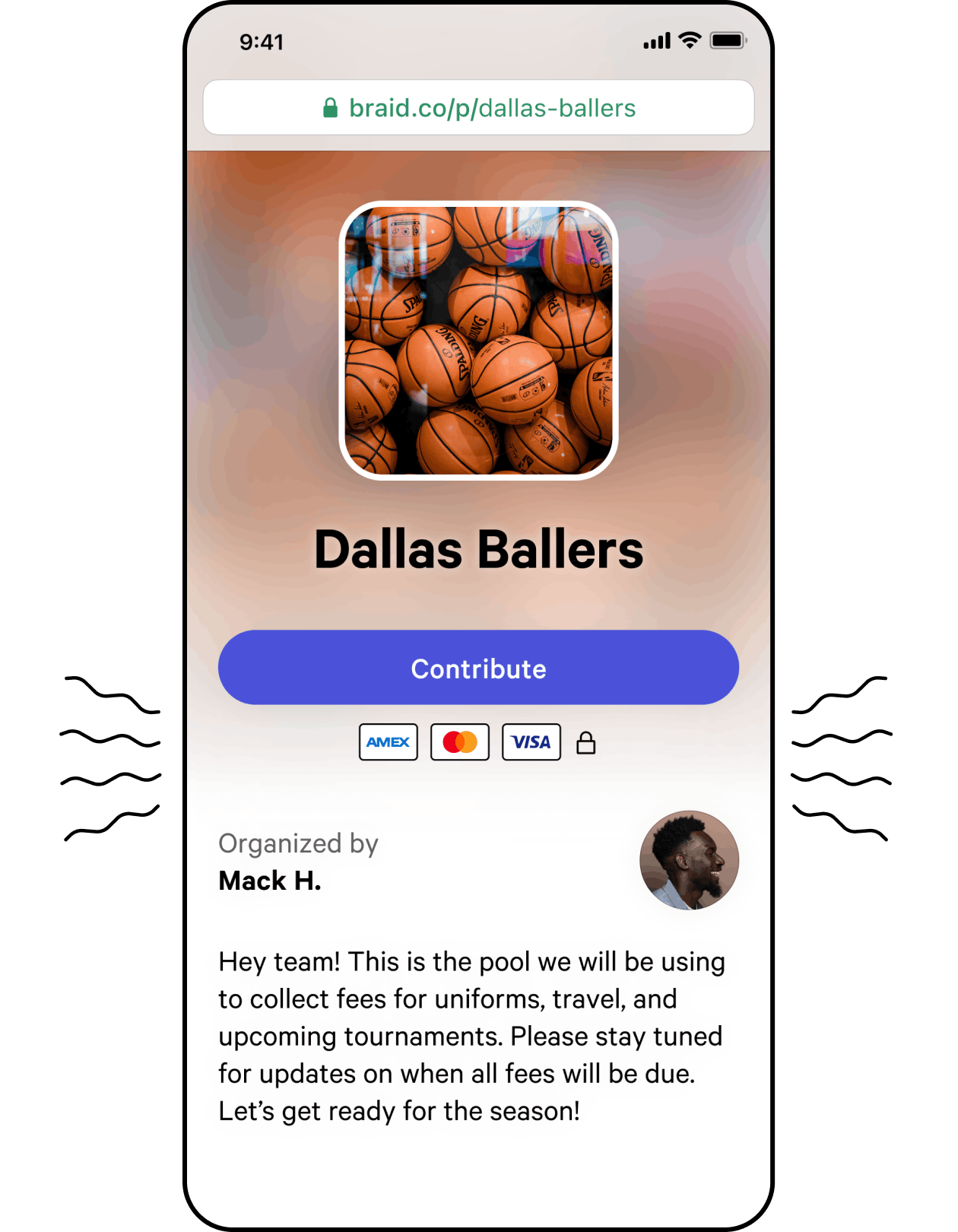 Contributors don't need a Braid account to chip in. Simply share your Pool Link to collect money for team expenses like buying equipment and travel for games.