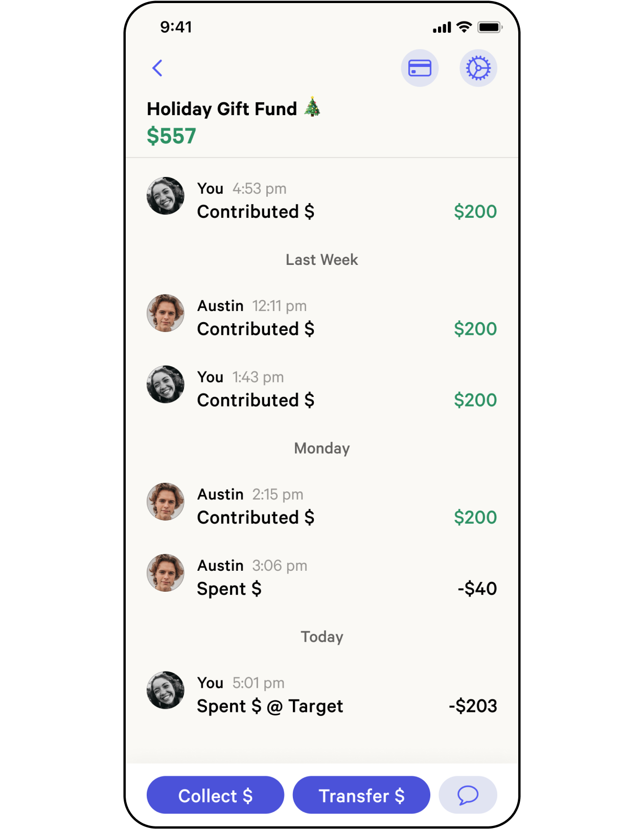 Get spending notifications from your pools, and freeze your debit card anytime in the app.