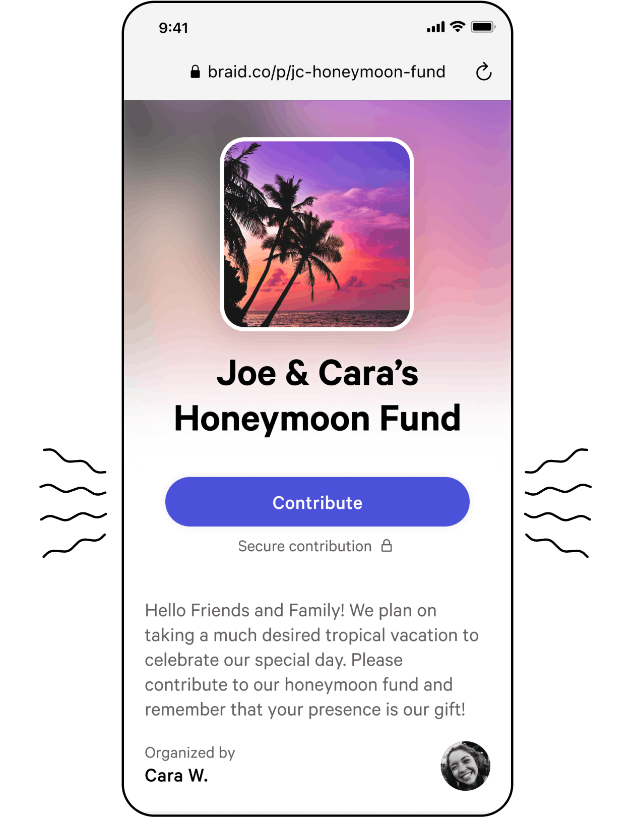Set up your honeymoon fund with Braid Money Pools. Collect cash for airfare, hotels, dining experiences, and more. Manage everything from your phone. Start here!