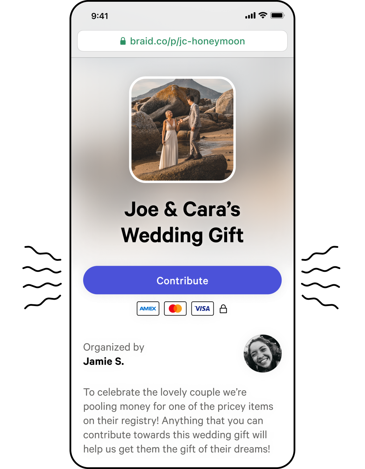 Contributors don't need a Braid account to chip in. Simply share your Pool Link to collect money. Use it to collect money for the couple’s cash registry, honeymoon fund, big-ticket wedding gifts, and more.